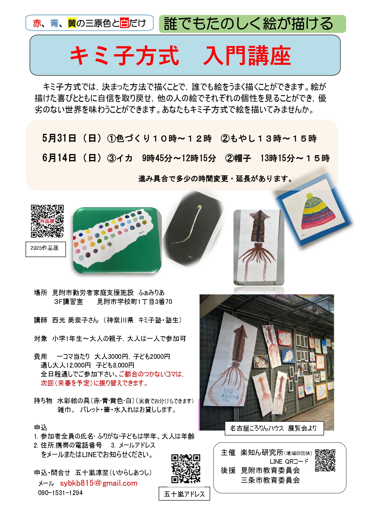 2025年9月23日,見附市ふぁみりでキミ子方式入門講座の前半を行いまた。講師は神奈川県藤沢市の西光美奈子さんです。参加者は5組11人でした。午前は色づくりをしました。赤・青・黄色・白のみでいろいろな色を作りました。考えないでやるのがポイントなのですね。